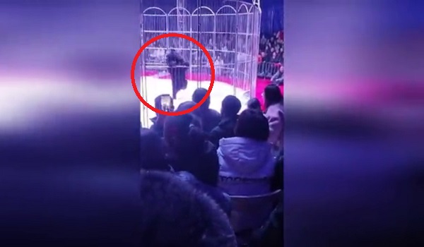 Kejadian dirakam di Chengnan Temple Fair Circus dekat bandar Dongying di sini menunjukkan haiwan itu dan jurulatihnya berada atas pentas pada 10 Februari lalu.