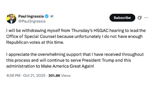 Dalam satu hantaran di platform X, Ingrassia memaklumkan beliau menarik diri daripada sesi pendengaran yang dijadualkan Khamis ini di hadapan jawatankuasa Senat kerana “tidak mempunyai sokongan mencukupi daripada ahli Republikan pada masa ini”.