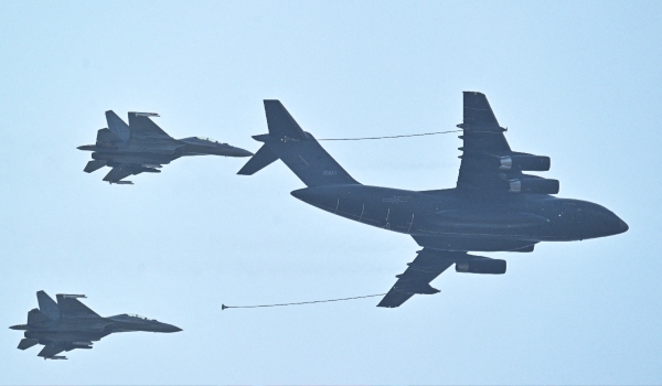 Di udara, pesawat dilengkapi radar melintasi ruang perarakan, menonjolkan keupayaan pengawasan China.