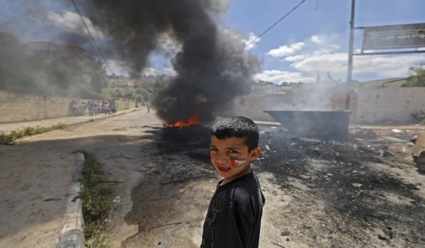 (Anak Palestin berdiri di hadapan tayar yang terbakar di kem pelarian Jenin, Tebing Barat
