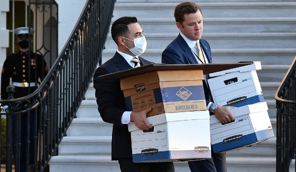 (Beberapa kotak dibawa keluar dari Bangunan Pejabat Eksekutif Eisenhower di perkarangan Rumah Putih sebelum