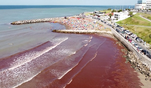 MAR DEL PLATA, 23 Februari- Pantai Mar del Plata di Argentina antara beberapa pantai di pesisir Atlantik yang dilitupi fenomena ‘red tide’ atau air pasang merah akibat pembiakan makroalga secara besar-besaran.