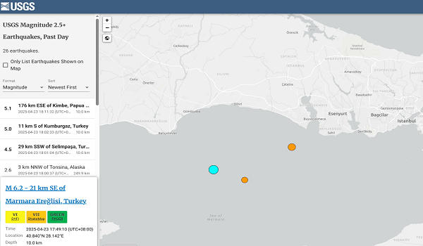 ISTANBUL, 23 April- Sebuah gempa bumi berukuran 6.2 magnitud melanda Laut Marmara berhampiran pinggir barat Istanbul hari ini.