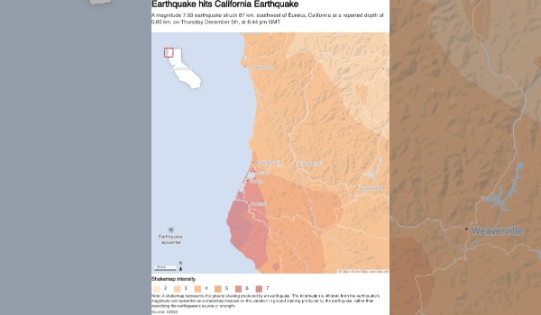 Menurut Kajian Geologi Amerika Syarikat gempa yang berpusat kira-kira 39 batu (63 km) barat bandar Ferndale pada kedalaman cetek 10 km di pantai utara California.
