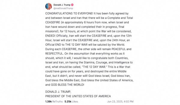 Presiden Amerika Syarikat, Donald Trump menerusi laman Truth Socialnya mengucapkan tahniah kepada Israel dan Iran yang akan menamatkan konflik mereka.