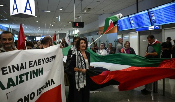 Setibanya di Lapangan Terbang Antarabangsa Athens, aktivis yang dibebaskan mengibarkan bendera Palestin sambil melaungkan slogan “Freedom for Palestine!” dan “Long live the flotilla!”