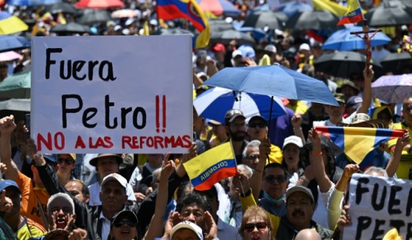 “Keluar, Petro!,” tulis sepanduk yang dipegang oleh penunjuk perasaan di Bogota sambil mengibarkan bendera Colombia.