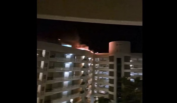 Imej menunjukkan api marak terang menyala di atas bumbung hotel.