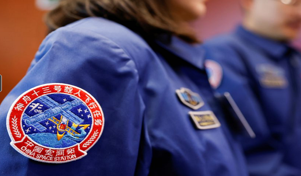 (Logo pada pakaian rasmi pasukan kapal angkasa Shenzhou-13 semasa sidang media pelancarannya/FOTO FAIL REUTERS)