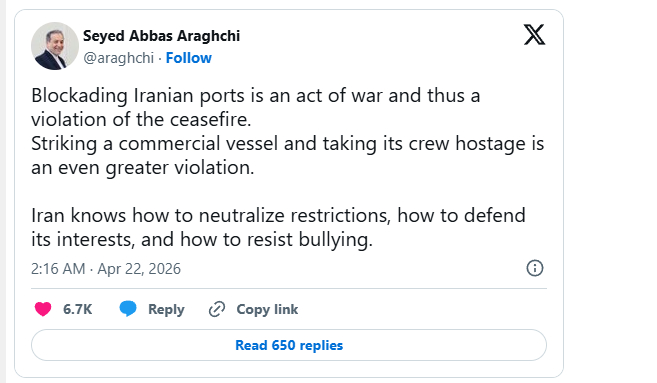 - Menteri Luar Abbas Araghchi menyatakan serangan terhadap kapal komersial dan penahanan anak kapal adalah pelanggaran lebih serius melalui hantaran di X.