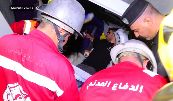 Rakaman video menunjukkan sebuah kenderaan rosak teruk, manakala pasukan pertahanan awam giat menjalankan operasi mencari mangsa dan memberikan rawatan kecemasan.