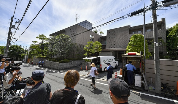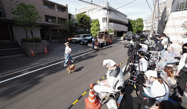 (Petugas media berkumpul di kawasan perumahan Abe di Tokyo / Foto AFP)