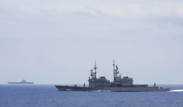 Kementerian Pertahanan Taipei pada hari Rabu mengeluarkan gambar tidak bertarikh menunjukkan Shandong dipantau oleh kapal perang Taiwan kelas Keelung.
