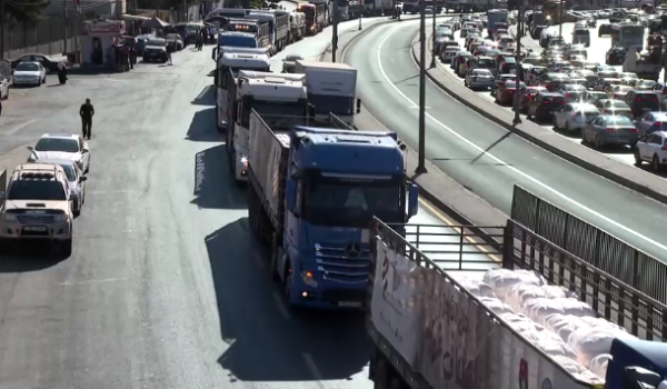 Beberapa buah trak dilihat bergerak di lebuh raya utama di ibu negara Jordan, Amman, membawa bekalan bantuan yang dipercayai untuk penduduk Gaza yang terjejas teruk akibat konflik berpanjangan.