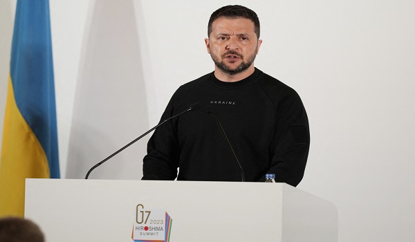 (Volodymyr Zelensky berucap pada sidang akhbar selepas Sidang Kemuncak Pemimpin G7 di Hiroshima/AFP)