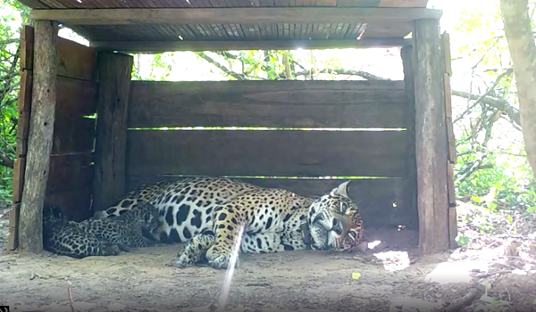 Rakaman dari yayasan itu menunjukkan ibu jaguar, Tania memberi makan kepada dua anaknya dan berehat bersama dalam sarang mereka.