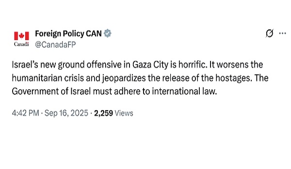 OTTAWA, 17 September – Kementerian Luar Kanada pada Selasa menyifatkan serangan darat terbaharu Israel di Bandar Gaza sebagai “tidak berperikemanusiaan”.