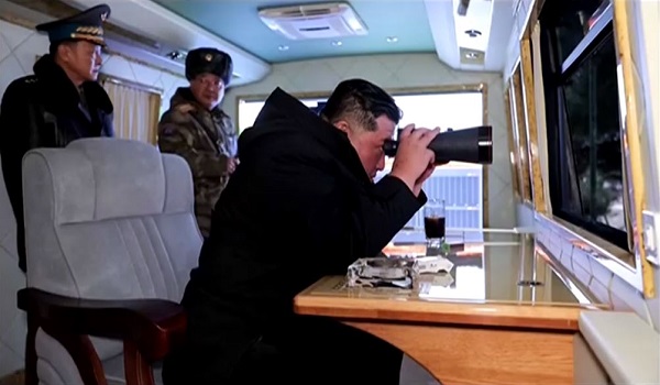 Gambar yang disiarkan oleh Televisyen Pusat Korea (KRT) menunjukkan peluru berpandu itu meluncur ke udara dengan disertai nyalaan api ketika Kim memerhati melalui teropong.