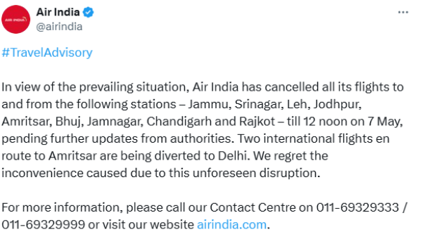 Air India mengumumkan pembatalan semua penerbangan masuk dan keluar dari sembilan bandar, termasuk Jammu, Srinagar dan Leh di Kashmir , Jamnagar, Rajkot dan Bhujuj di negeri Gujarat, serta Amritsar di negeri Punjab, barat laut India.