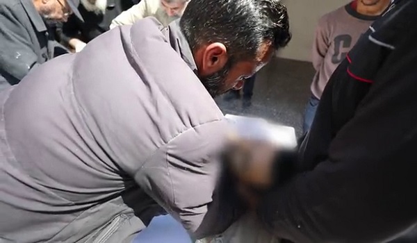 Penduduk yang terkorban dibawa ke bilik mayat Hospital Al-Ahli Baptist.