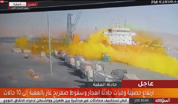 letupan gas berwarna kuning berlaku di pelabuhan Aqaba / Foto AFP)