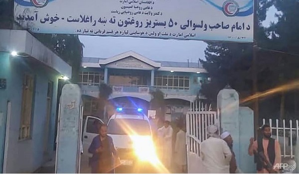 (Pejuang Taliban dan kakitangan perubatan berdiri di luar pintu hospital selepas letupan di daerah Imam Sahib, utara bandar Kunduz/ AFP)