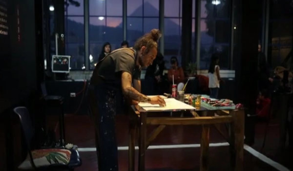 Para penyokong dilihat bersorak memberi semangat kepada artis tersebut dan memerhatikan hasil kerjanya, manakala yang lain dilihat melihat lakaran yang telah disiapkan.