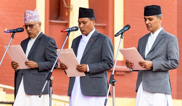 Majlis angkat sumpah diadakan di luar bangunan Pejabat Presiden yang musnah terbakar dan disempurnakan Presiden Ram Chandra Paudel kepada tiga menteri utama.