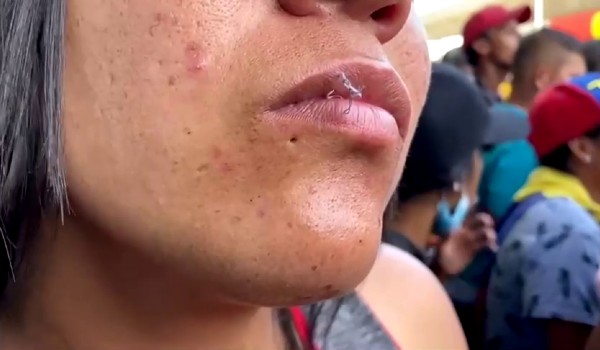 (Seorang wanita dari Venezuela menunjukkan mulutnya dijahit sebagai tanda protes