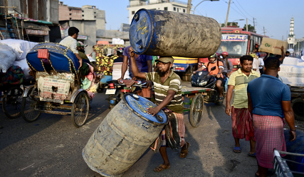 Seorang buruh mengangkut tong plastik di sepanjang jalan yang sibuk di sini / FOTO AFP