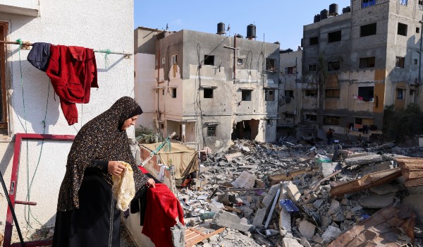 (Seorang wanita Palestin menggantung pakaian di rumahnya yang