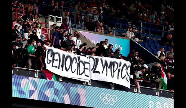 PARIS, 28 Julai- Bendera Palestin dan sepanduk bertulis genosid dan olimpik dibawa penonton ketika berlangsungnya perlawanan bola sepak antara Israel-Paraguay, semalam.