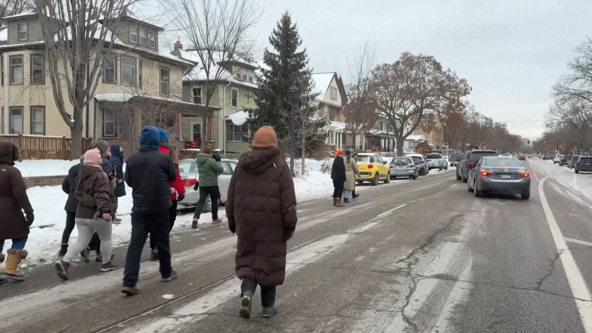 Sukarelawan dilihat terus berkumpul di luar Karmel Mall pada Khamis meskipun suhu paras beku dan mereka bersedia meniup wisel jika ternampak ejen ICE. -REUTERS
