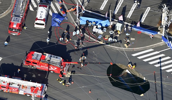 Menurut laporan Kyodo News, terdapat sistem pembetungan di kawasan persimpangan tersebut dan punca runtuhan jalan masih dalam siasatan.-AFP