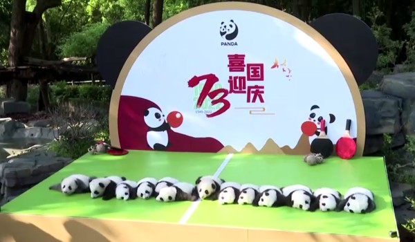 Bayi panda comel berkenaan kemudian diperagakan di pentas, membentuk angka “tujuh” dan “tiga” menandakan ulang tahun ke-73 penubuhan Republik Rakyat China.