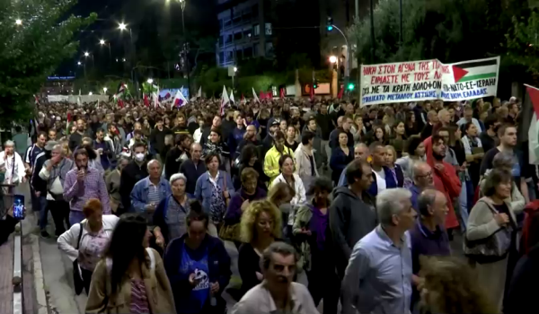 Penunjuk perasaan berarak dari Dataran Syntagma sambil membawa sepanduk dan bendera Palestin untuk menunjukkan sokongan kepada negara tersebut.