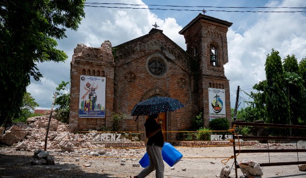 (Seorang wanita berjalan melepasi gereja yang terjejas selepas gempa bumi di Bangued, wilayah Abra pada 28 Julai/FOTO REUTERS)
