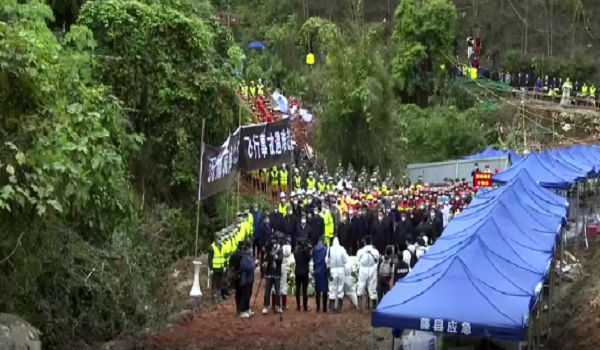 Pasukan penyelamat bertafakur selama tiga minit sambil bunyi hon kedengaran bergema di seluruh kawasan pergunungan di daerah Tengxian, Wilayah Autonomi Guangxi Zhuang di selatan China.