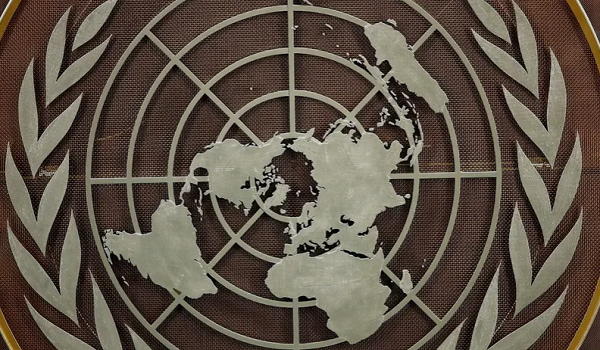 (Logo Pertubuhan Bangsa Bersatu dilihat di Dewan Perhimpunan Agung di New York City,