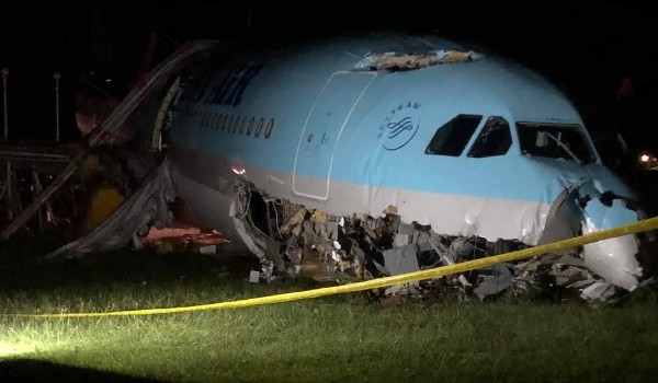 (Bahagian depan yang rosak dari pesawat Korean Air selepas ia melepasi landasan