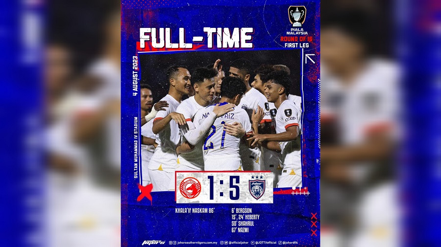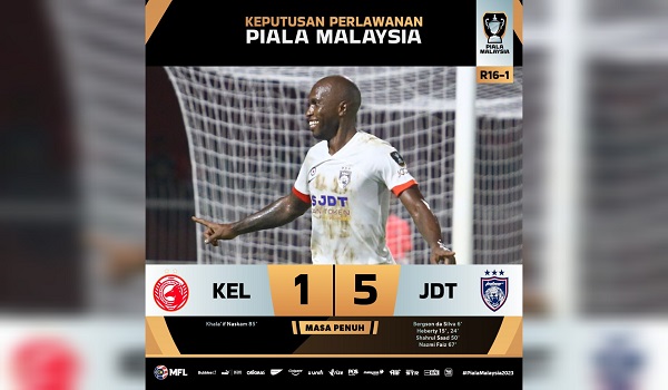 Shahrul Saad kemudian menyumbat gol keempat pasukan kendalian Esteban Solari apabila menyudahkan satu sepakan sudut pada minit ke-50 sebelum Nazmi Faiz melengkapkan malam gemilang buat JDT dengan gol kelima hasil hantaran Daryl Sham.