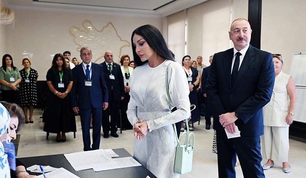 Presiden Azerbaijan Ilham Aliyev, isteri Mehriban Aliyeva dan anak perempuan, Leyla Aliyeva, melaksanakan tanggungjawab mereka pada awal hari di sebuah pusat mengundi di Baku.