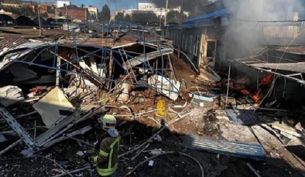 (Anggota bomba memadamkan kebakaran pasar di Bakhmut, wilayah Donetsk, di tengah-tengah pencerobohan