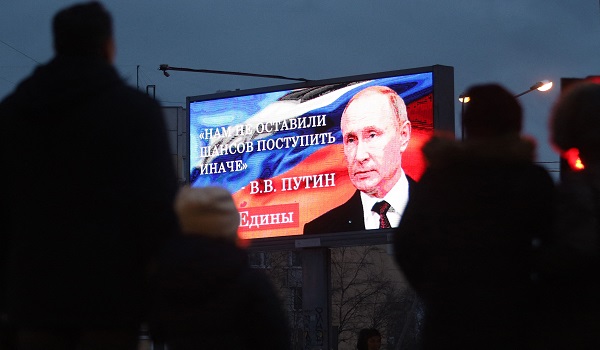(Orang ramai berkumpul di hadapan skrin yang memaparkan imej Presiden Rusia Vladimir Putin)