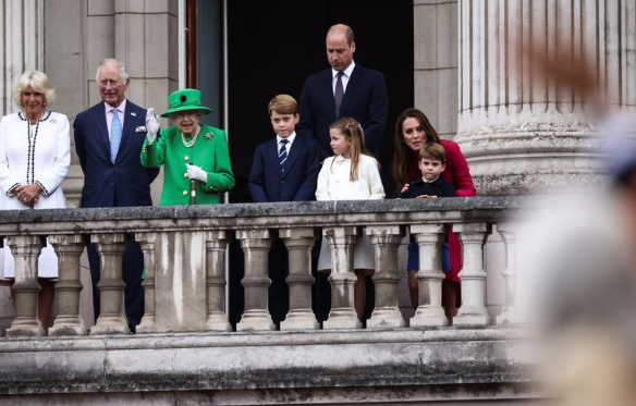 Tampil berbusa rona hijau yang dipadankan dengan topi dan sarung tangan putih sambil menggenggam tongkat, baginda diapit tiga bakal Raja iaitu Putera Charles, Putera William dan Putera George.