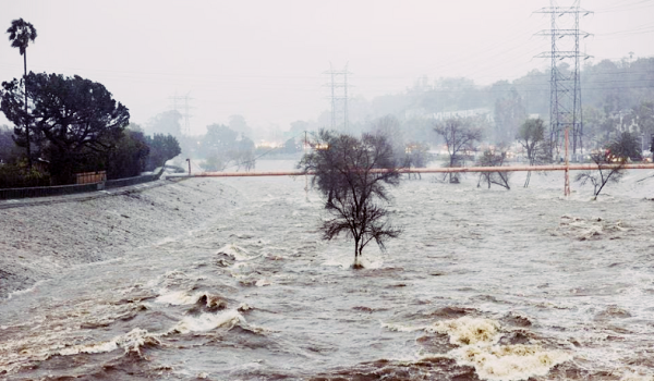 (Sungai Los Angeles semasa ribut musim sejuk yang jarang berlaku di Los Angeles, California/REUTERS)