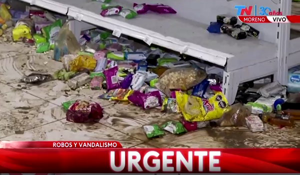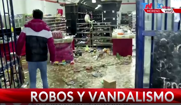 Rakaman dari stesen televisyen tempatan menunjukkan kemusnahan di sebuah pasar raya di Moreno, berikutan rompakan.