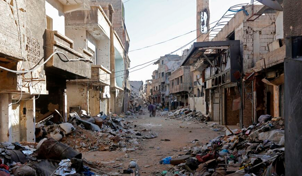 (Orang ramai berjalan di tengah-tengah runtuhan bangunan yang musnah di selatan ibu kota Syria Damsyik pada 3 November 2018/AFP)