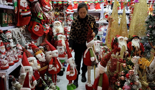 BEIJING, 25 Disember- Pokok Krismas gergasi yang dihiasi dengan lampu dan kotak hadiah di pusat beli-belah bergemerlapan di bandar Shanghai dan Chongqing.
