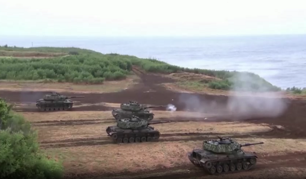 Di pantai pulau Penghu kereta kebal beratur di sepanjang persisir pantai sambil melepaskan tembakan ke arah sasaran suar di laut dengan anggota tentera lain mengambil kedudukan masing-masing dengan peluru berpandu mudah alih.